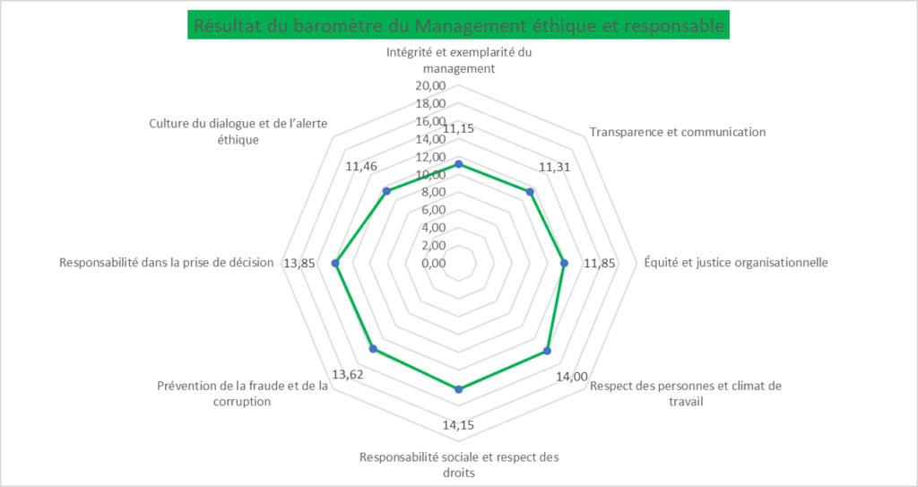 Dans une seconde phase du travail, les différents résultats individuels ont été agrégés afin de construire un baromètre exploratoire du management éthique et responsable. Cette analyse collective a permis d’identifier certaines tendances communes, des pratiques particulièrement vertueuses, mais également des zones de vigilance récurrentes dans les organisations observées (figure suivante).